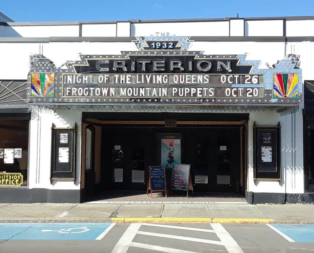 The Criterion Theatre was named after Picadelli circus in London when it was erected in 1932 at the height of the Art Deco movement. The theater is considered one of only two remaining art deco theaters in the state. The brightly lit marquee sits above the entrances, projecting light from a hundred light bulbs onto the street below. Your first thought upon entering the theater would be one of opulence and dedication to the history of the space. The stage and seats are awash with red velvet and golden fixtures. An original chandelier sits above the heads of patrons, shining through the antique glass and illuminating the space. You might also find an original art deco mural on the wall, a relic that survived and was restored during its renovation.